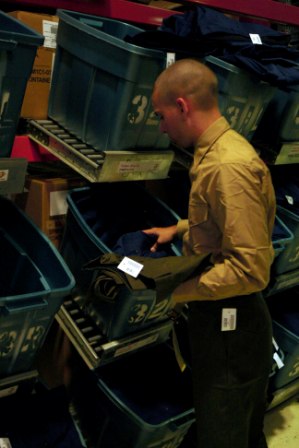 A recruit from Alpha Company picks up a pair of service and blue-dress trousers during Phase 2 clothing. Recruits receive a full set of service and dress uniforms, which are marked for alterations. (Photo by Lance Cpl. Javarre Glanton)