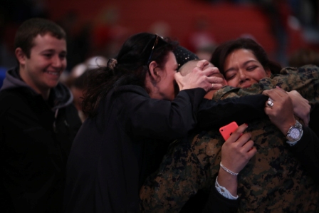 Family members tightly embrace their new Marine of Alpha Company, 1st Recruit Training Battalion, following the Family Day ceremony Jan. 23, 2014, on Parris Island, S.C. (Photo by Cpl. Octavia Davis)