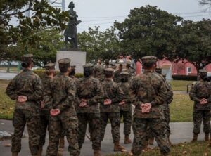 Marines with November Company, 4th Recruit Training Battalion, stand around the Molly Marine statue for an award ceremony on Parris Island, Dec 16, 2020. (U.S. Marine Corps photo by Lance Cpl. Michelle Brudnicki)