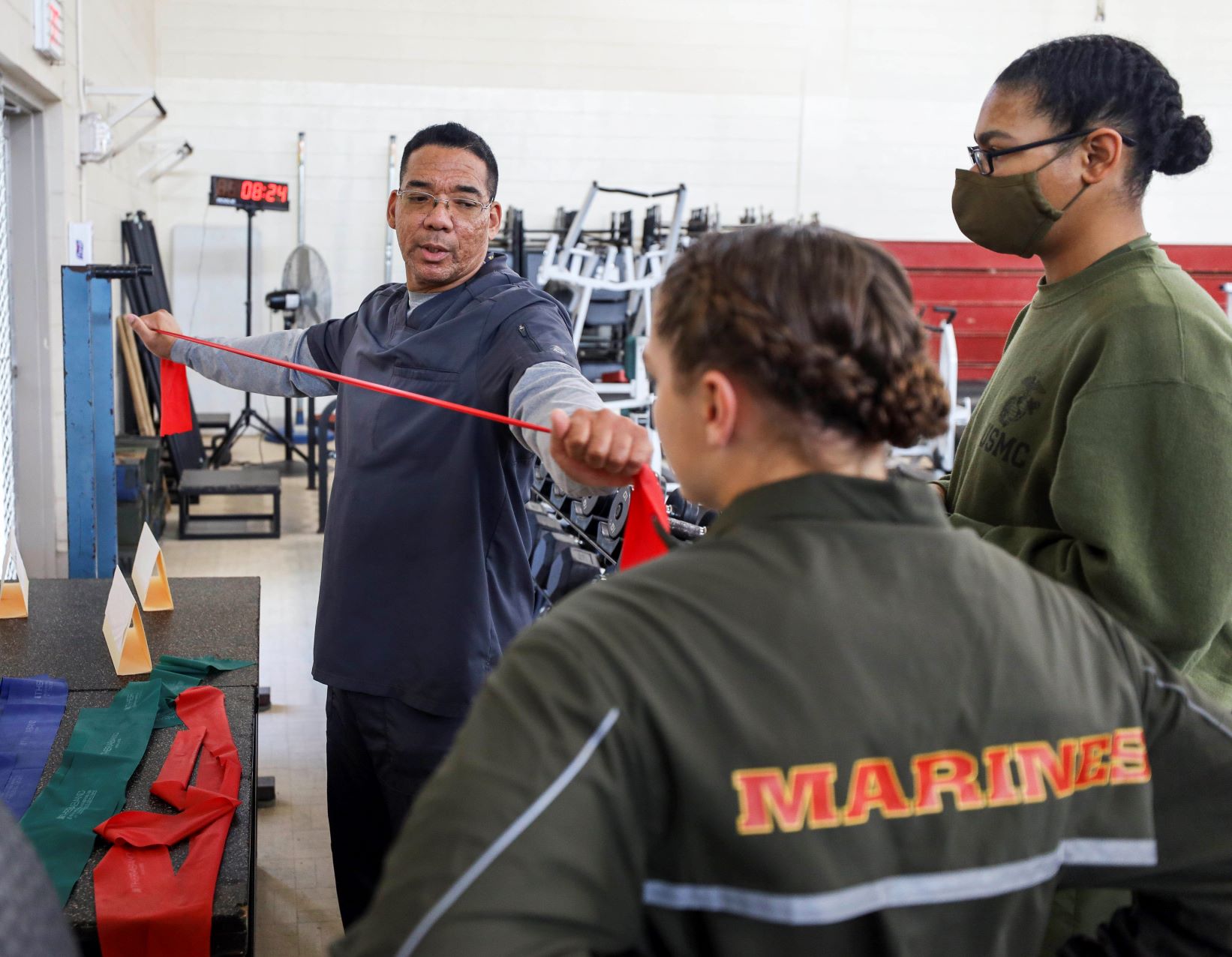 Scott Williams, an athletic trainer certified with the Smart Clinic, teaches a Marine proper form for his recovery exercise aboard Marine Corps Recruit Depot Parris Island, SC. (U.S. Marine Corps photo by Lance Cpl. Samuel C. Fletcher)
